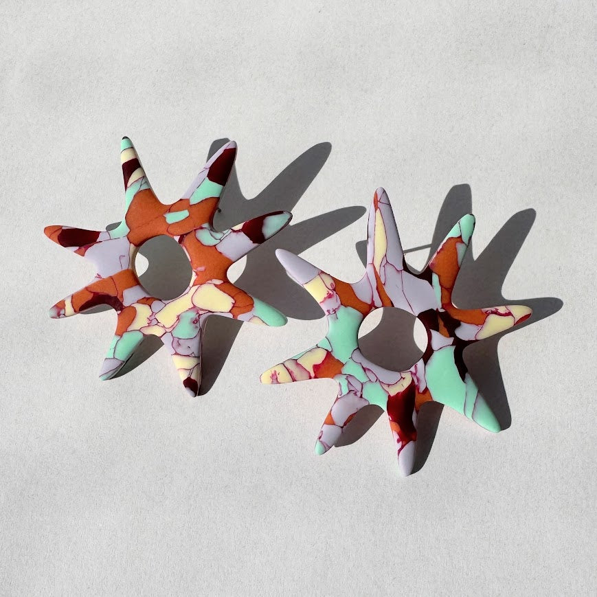 Colores vibrantes, formas libres y un aire psicodélico. Una mezcla de arcillas y pintura que da vida a piezas únicas, atrevidas y ligerísimas. Pura nostalgia con espíritu actual